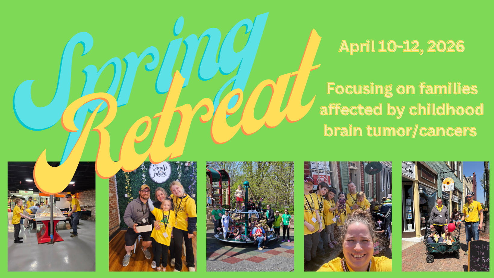 A family weekend retreat, April 10 - 12, 2026. This three-day event focuses on brain tumor families in